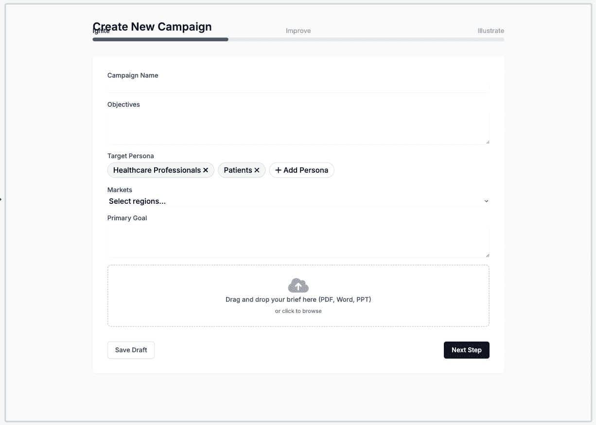 Create an AI-first, centralized platform that turns pharma campaign briefs into compliant, MLR-ready promotional assets with built-in version control so teams can reduce bottlenecks and launch engaging campaigns faster.