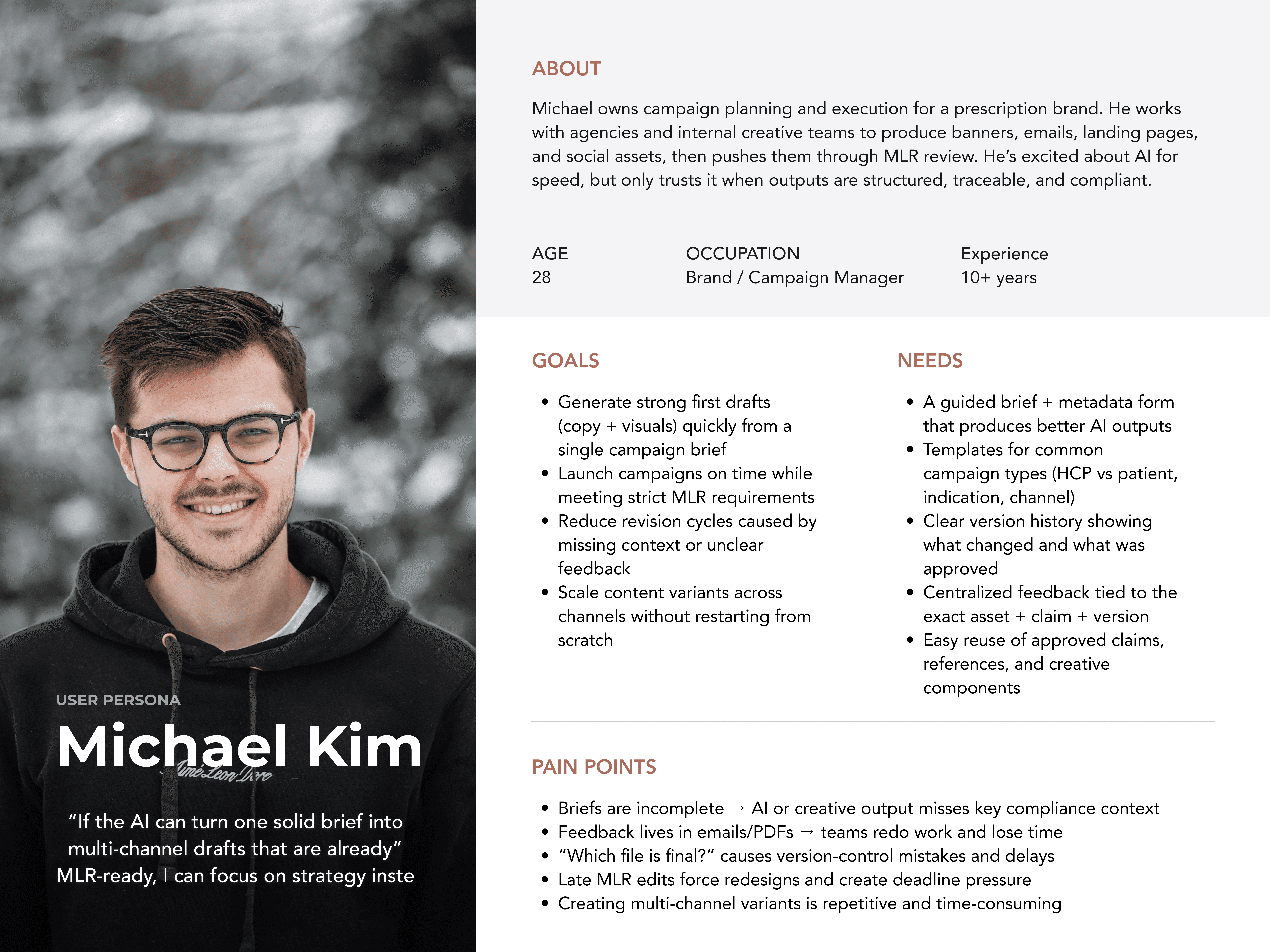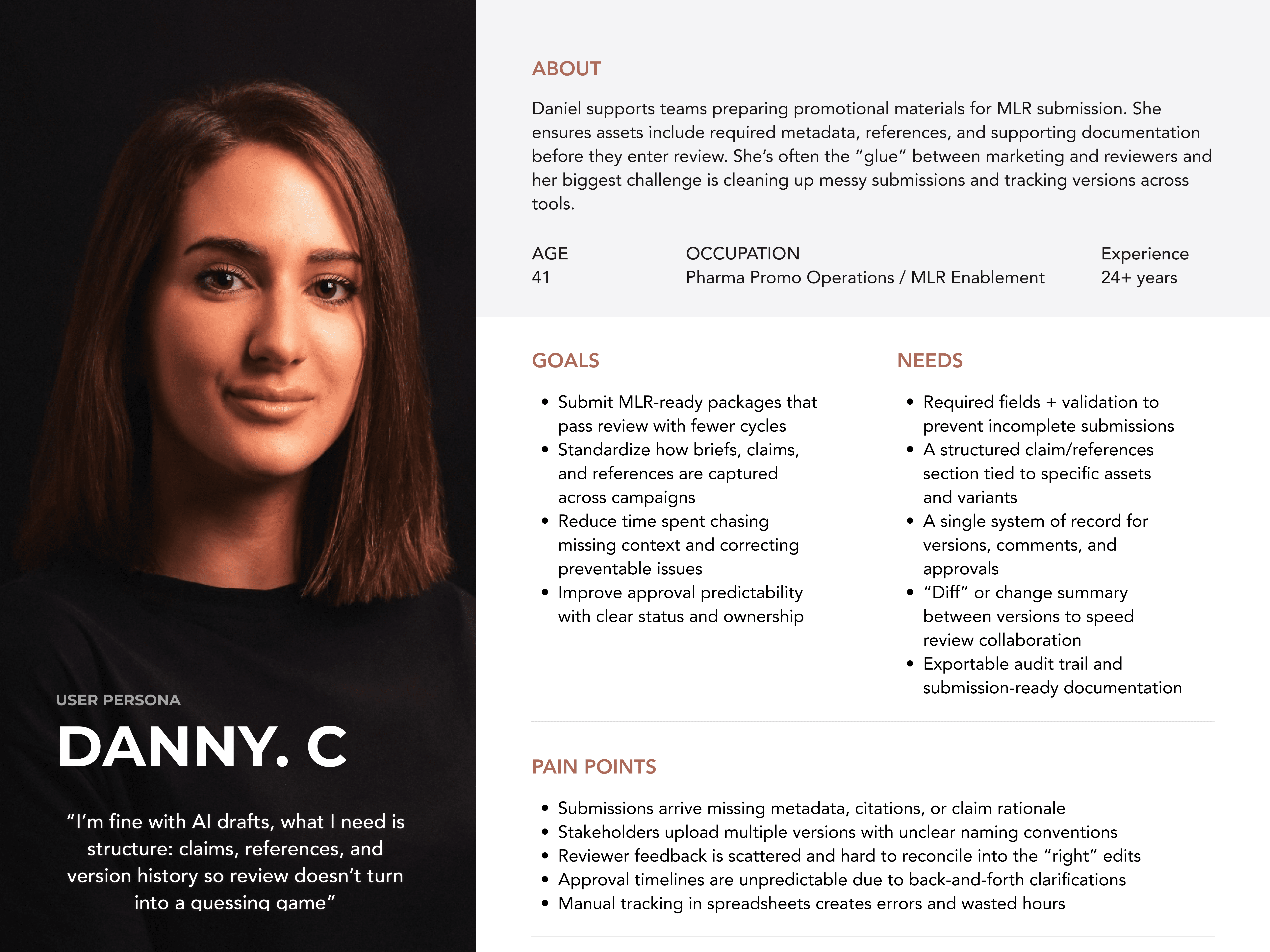 Workflow shadowing: Mapped the real “brief → draft → review → rework → approve” loop and where time is lost (tool switching, missing context, unclear feedback). Artifact review: Studied briefs, submission forms, and review checklists to understand what “MLR-ready” actually requires. Bottleneck analysis: Identified the biggest delays: unclear briefs, scattered comments, and late-stage compliance fixes.
